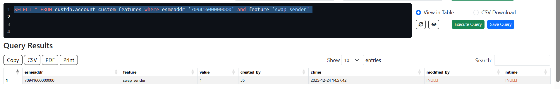 SELECT * FROM custdb.account_custom_features where esmeaddr='70941600000000' and feature='swap_sender'